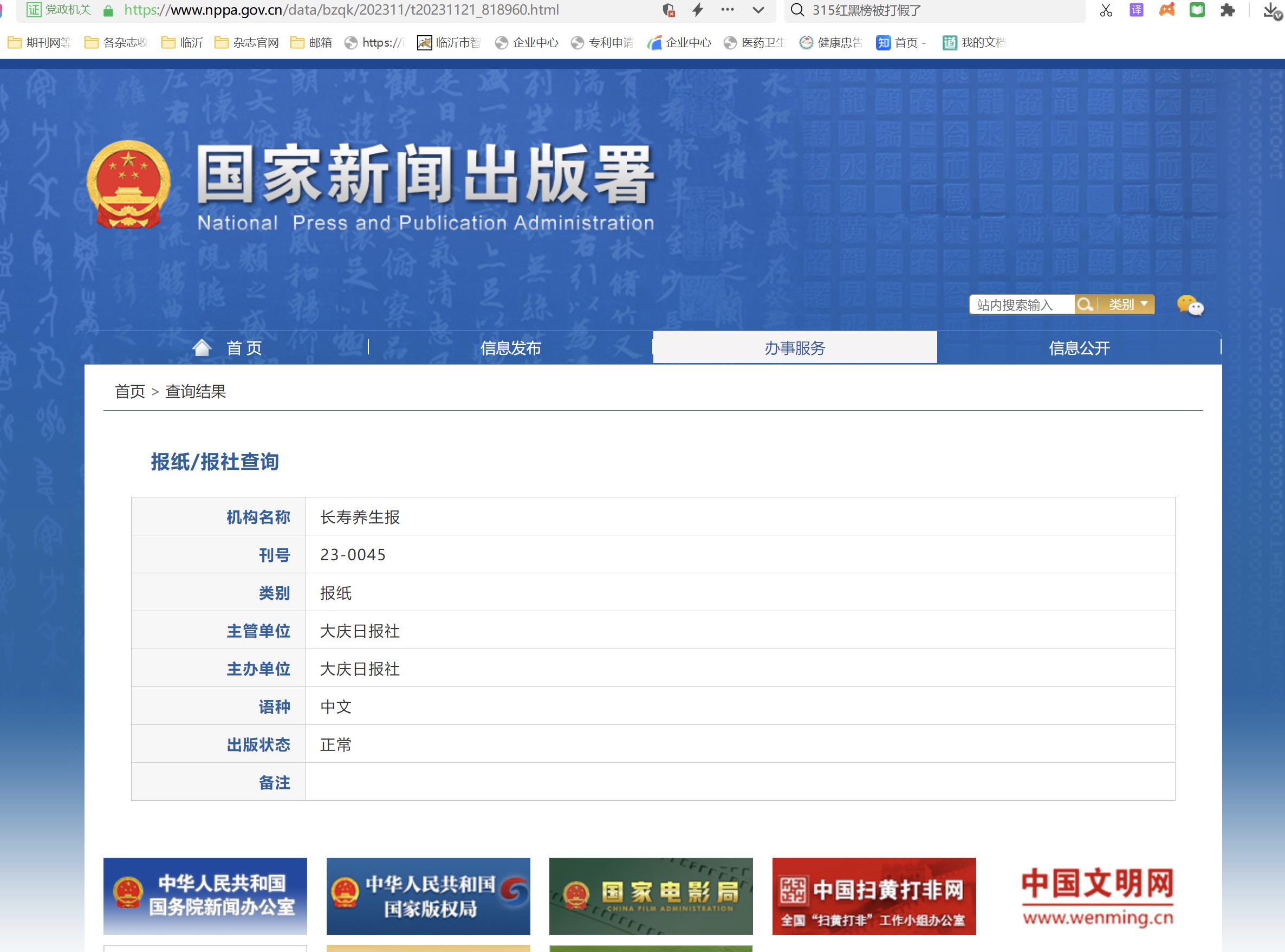 《长寿养生报》隶属于大庆新闻传媒集团有限责任公司,主管单位 大庆日报社 ,主办单位 大庆日报社。 国内统一刊号:CN23-0045,邮发代号2-115。